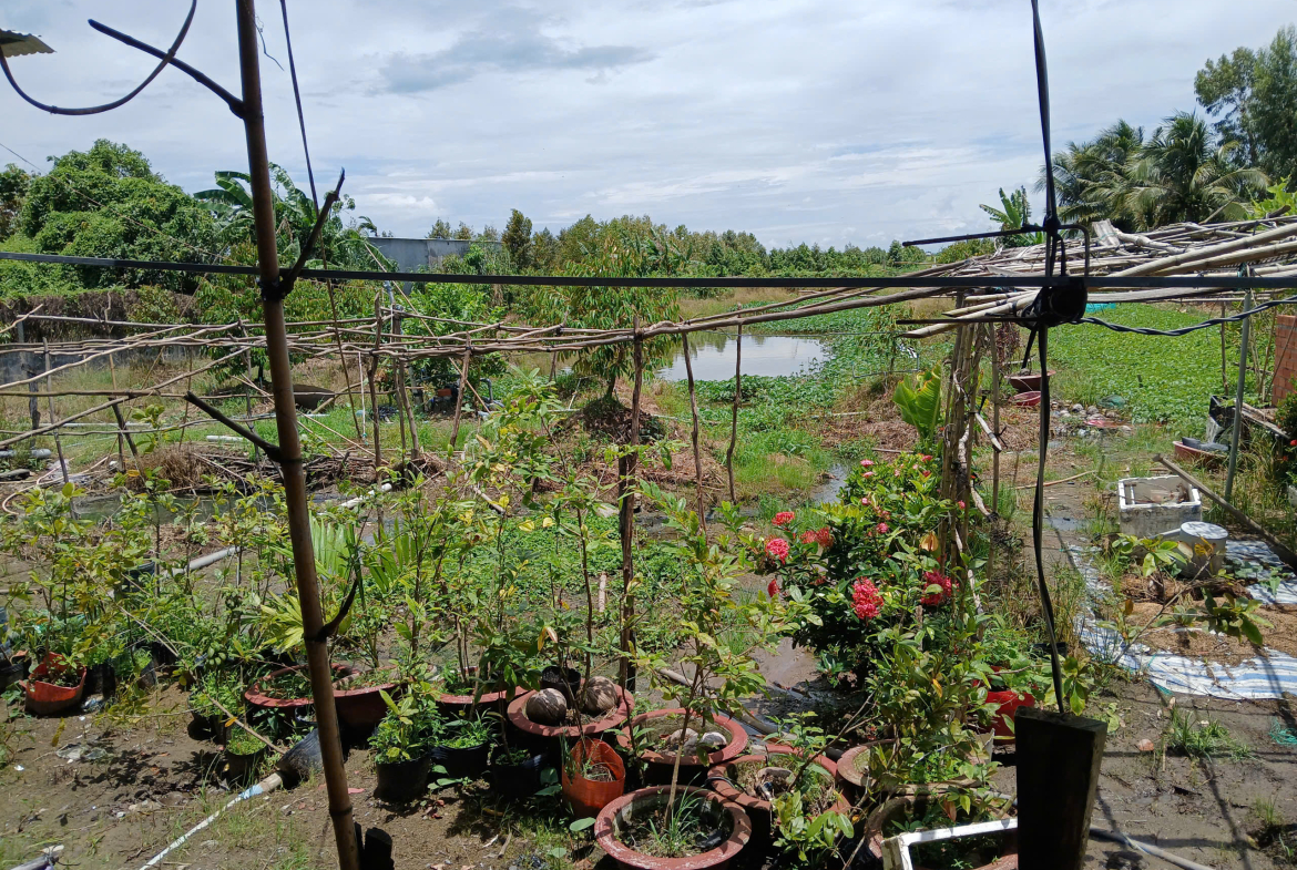Phần đất vườn đã trồng sẵn gần 30 cây sầu riêng hơn 1 năm tuổi phía sau nhà